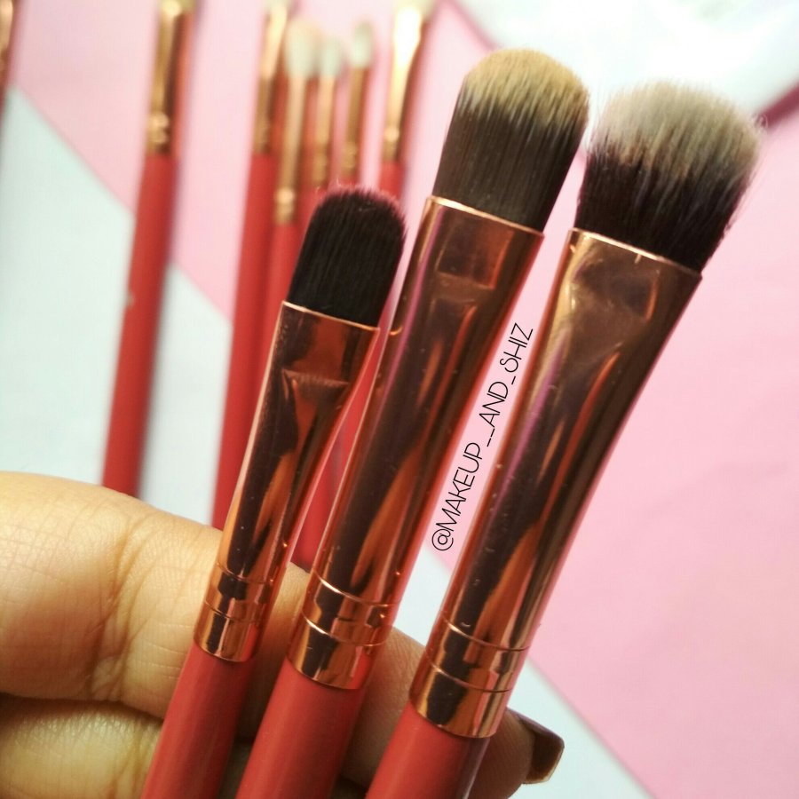 They are red and golden packaging. Some of them have white bristles ( the blending brush ) and some of them has black ( the flat ones ) . There are 12 of them :