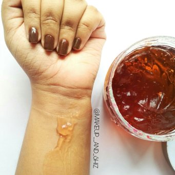 It has a gel consistency. It reminds me of Aloe Vera gel. In the tub, it looks like reddish-coffee color. On taking a little scoop of it , The color is toned down a little. It smells strongly of coffee. (However after 2-3 mins of application that goes away)