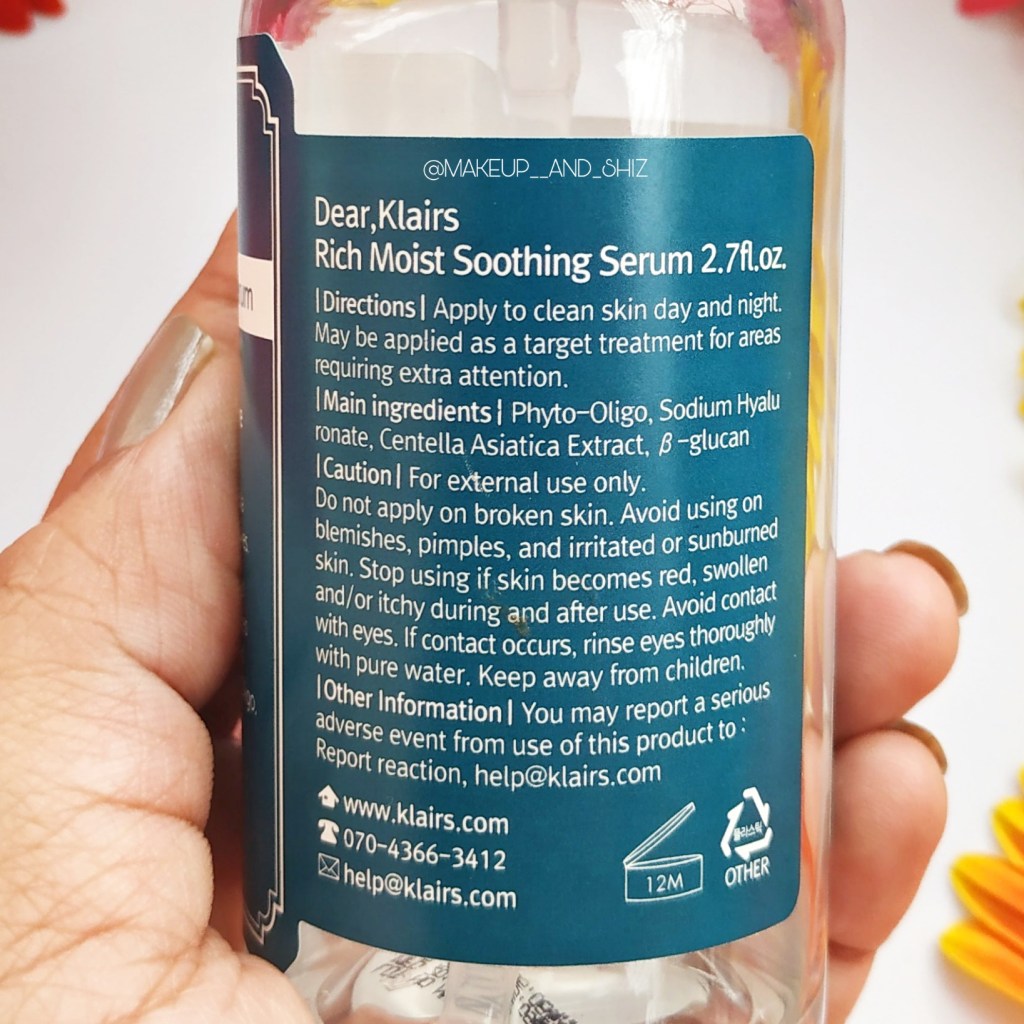 Klairs rich soothing serum is a serum for sensitive skin and is supposed to be a hydrating serum. Klairs soothing serum is gel like – transparent , neither too thick nor too thin. It has no fragrance whatsoever. It is supposed to be applied on damp skin as all hydrating products ( toners/ essence / serum/moisturizer ) . It takes 1-2 mins to be fully absorbed . It doesn’t leave your skin oily /greasy or sticky. It does soothe your face when you when you apply. The Klairs soothing serum really hydrates , calms your skin when its sun burnt/ irritated / red / or post shaving . After applying it definitely gives a plump hydrated feeling.